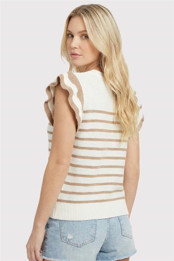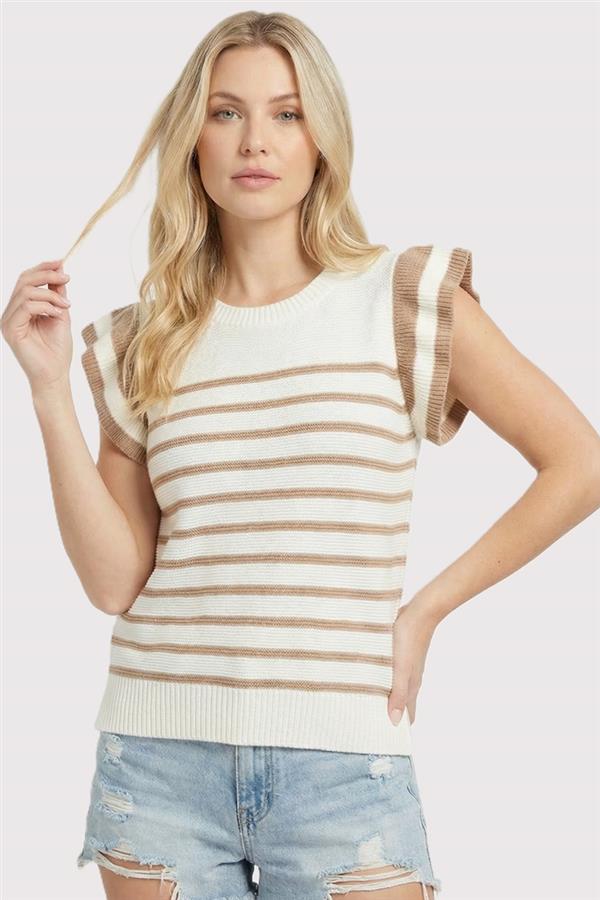 Crew Neck Cap Ruffle Sleeve, Color Block Striped Sweater