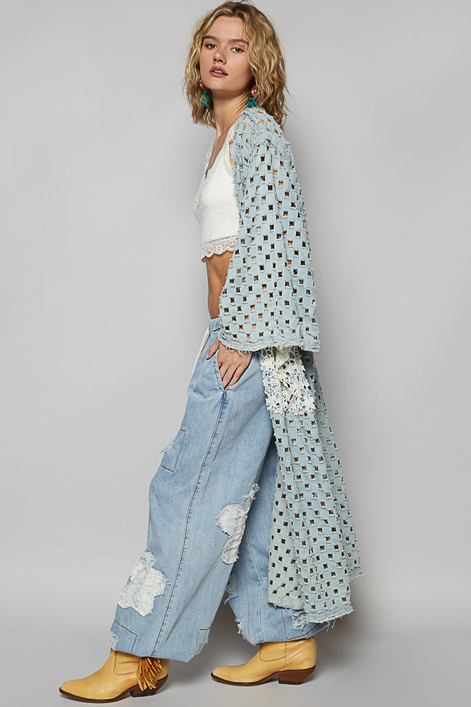 Designed in V-Neck Long Sleeve Roomy fit kimono top in cotton twill with laser distressing detailing and frayed edges. 100% cotton Color: Light Denim