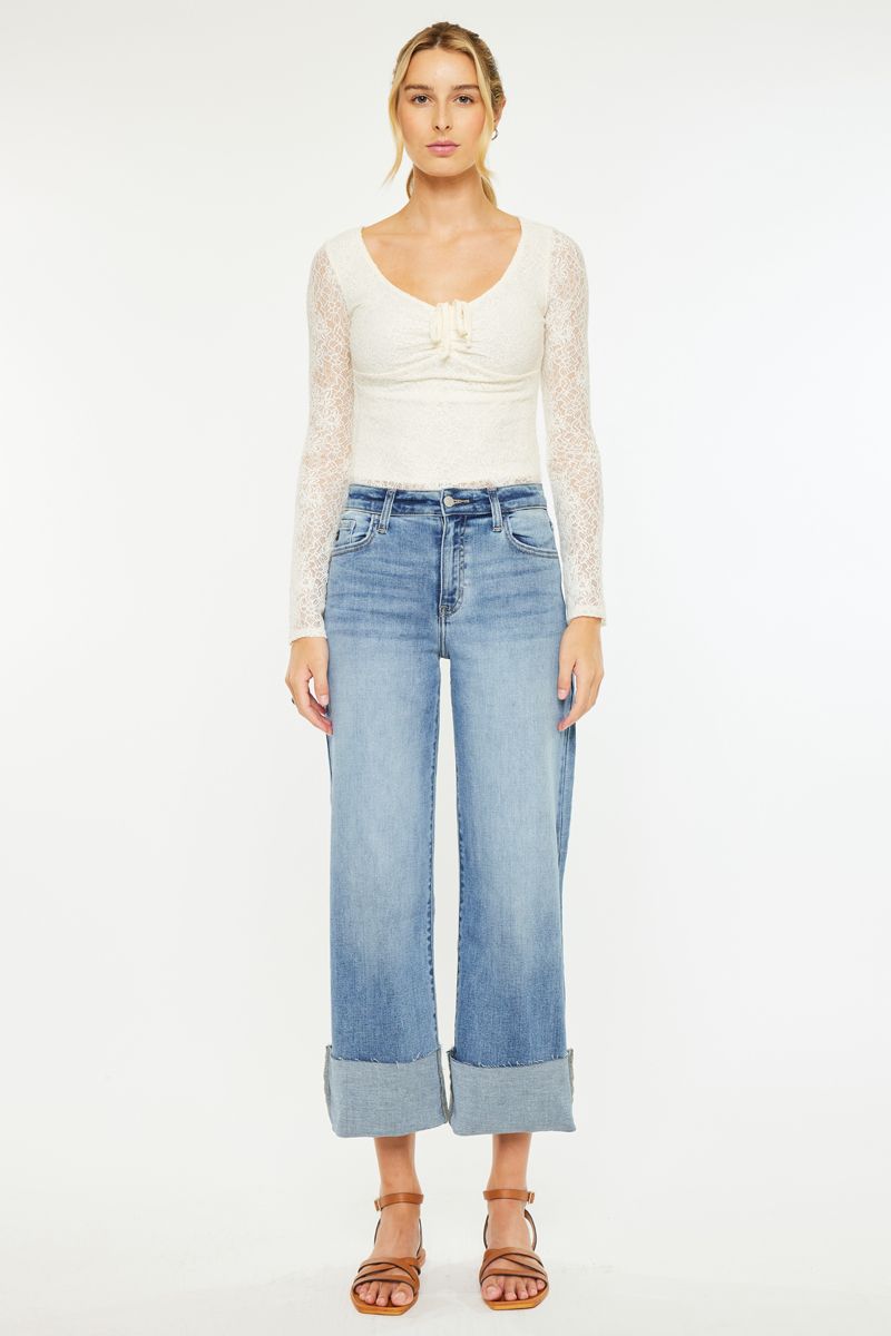High Rise Crop Wide Leg Jeans-KanCan Jeans Medium Stone Wash Stretch Zipper Fly Raw Edge ANC Cuffed Hem 5 Pocket Style Rise 10.5 Inseam 26 after Cuff