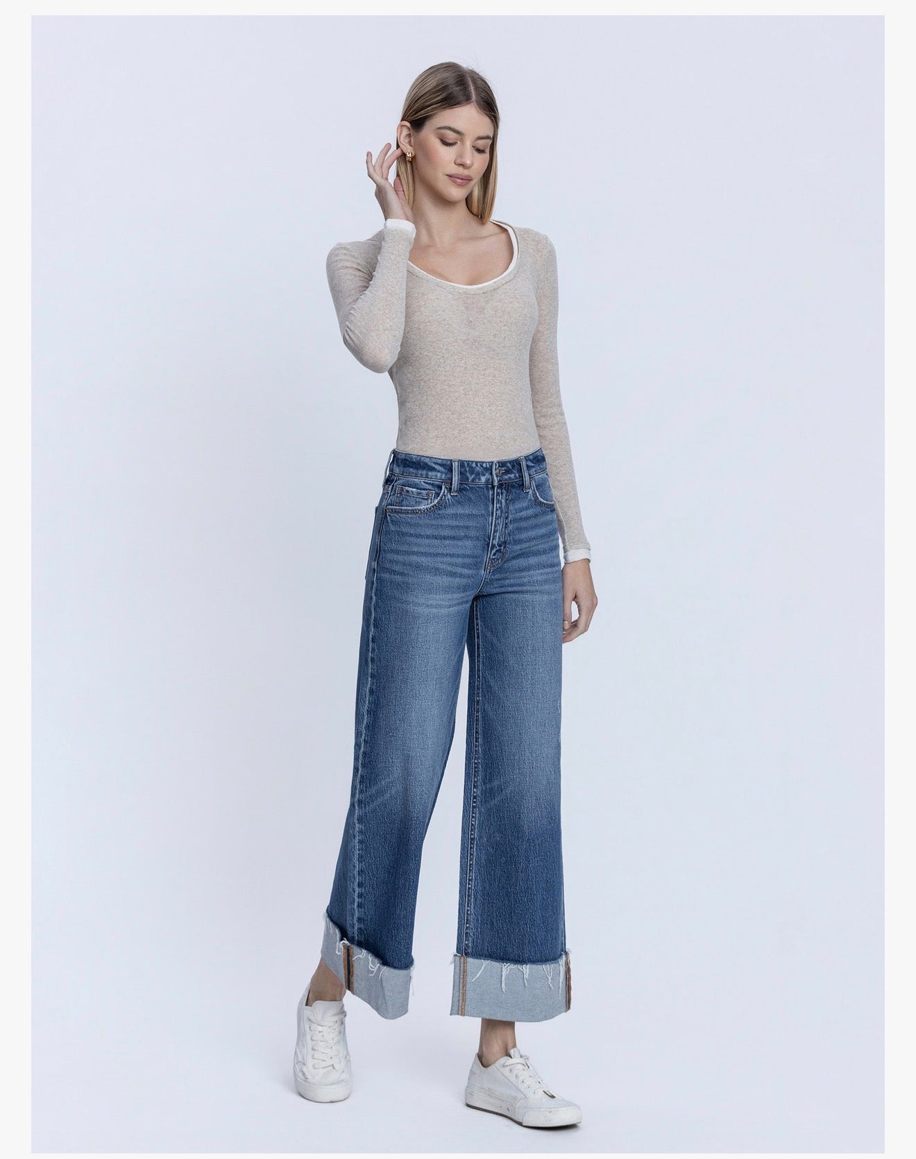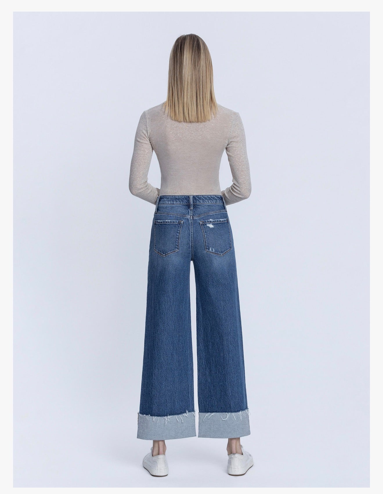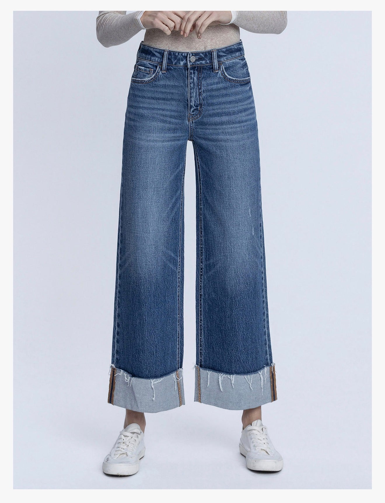 *Comfort Stretch Denim *High Rise Waist *5 Pockets *Single Cuff Raw Hem *Ankle Length *Medium Dark Wash *Wide Jeans