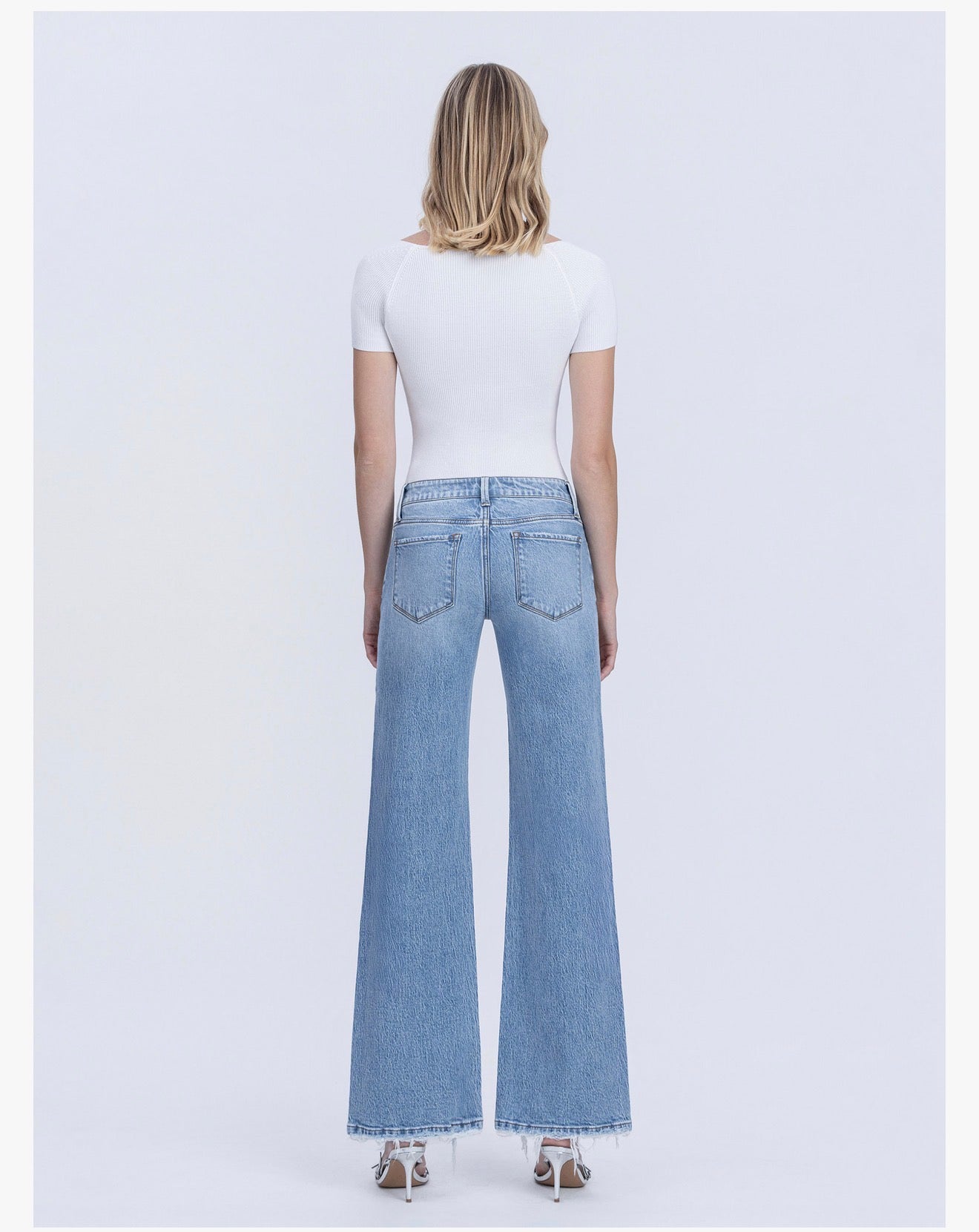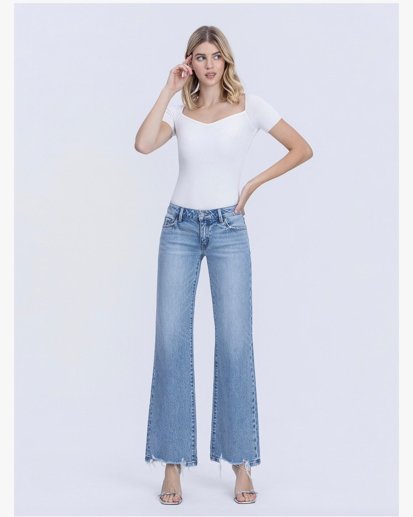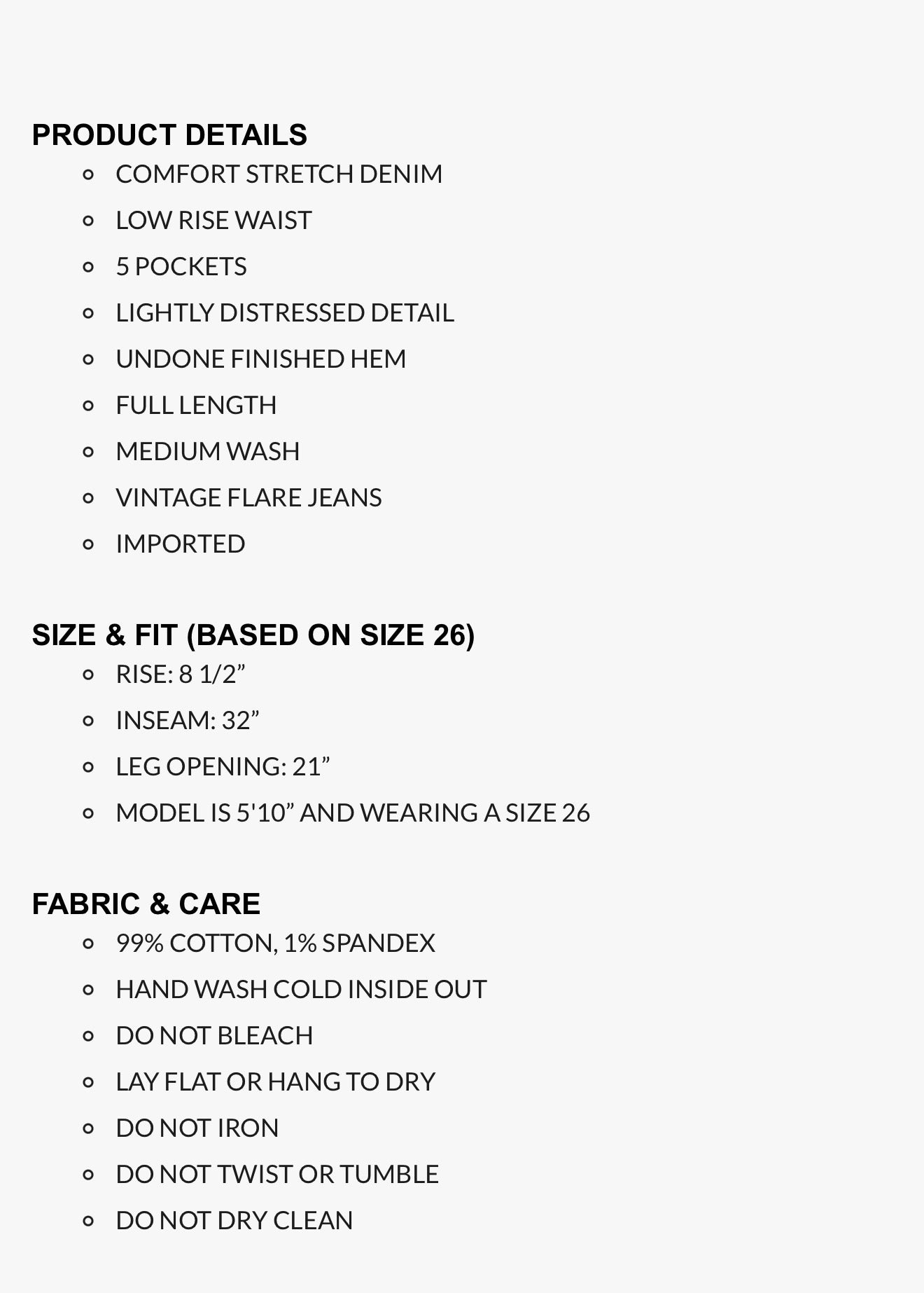 *Comfort Stretch Denim *Low Rise Waist *5 Pockets *Lightly Distressed Detail *Undone Finished Hem *Full Length *Medium Wash *Vintage Flare Jeans