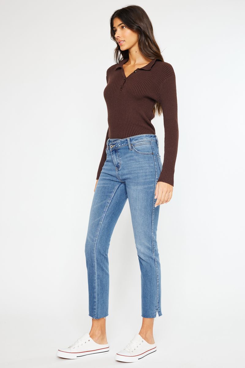 KanCan High Rise Cross Over Slim Straight Jeans Medium Stone Wash Clean Basic Straight Relaxed Denim Jean Stretch Crossover Waistband Raw Hem Side Slit Zip Fly Front Rise 10" Inseam, 28"