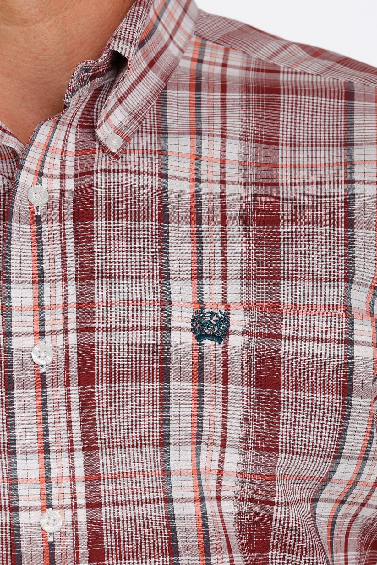 Comfortable cotton-spandex white plaid button down shirt with a pocket.