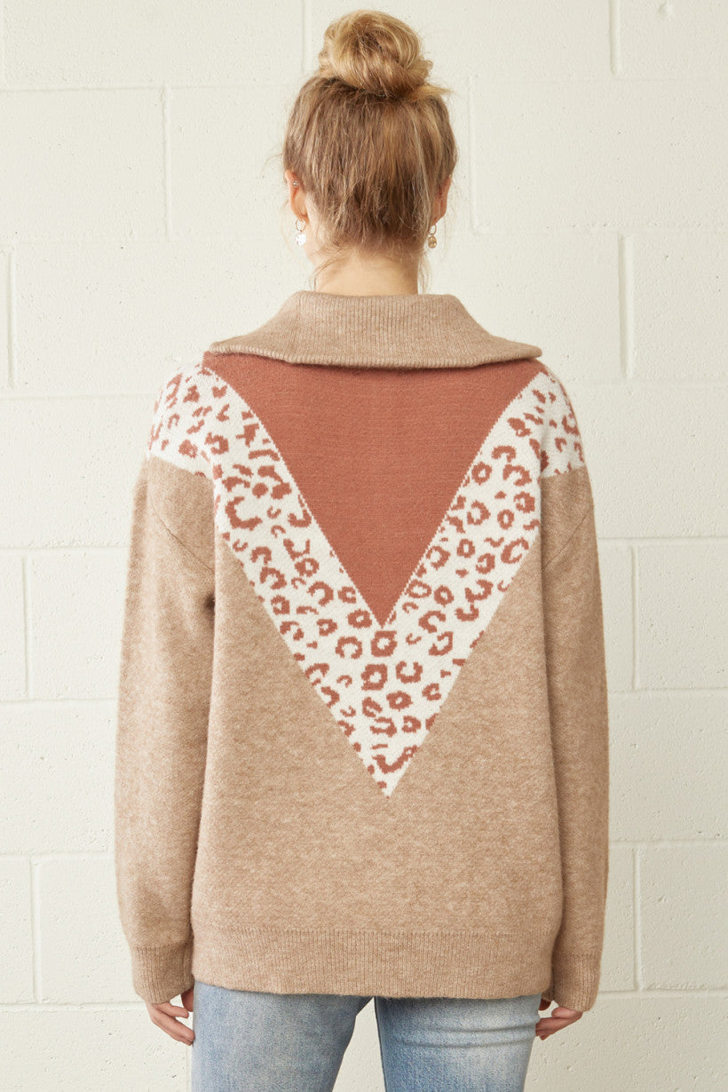 Leopard print colorblock long sleeve sweater featuring zip closure at neckline. Unlined. Knit. Non-sheer. Mediumweight.